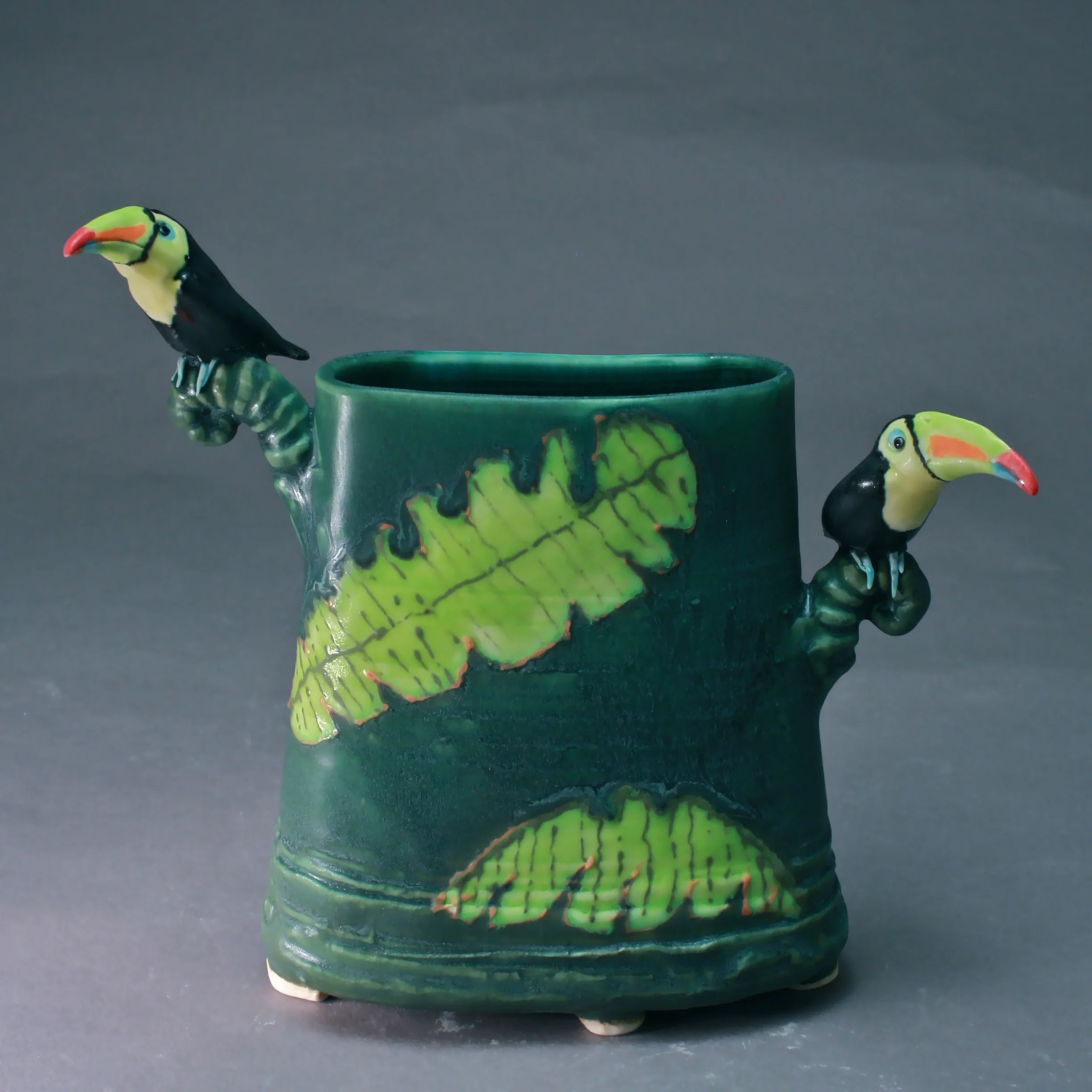 View fullsize V-28 | Banana Leaf Dark Green Envelope Vase with Toucans